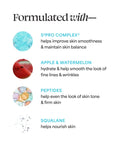 Lightweight, non-greasy cream Revives the appearance of dull & tired skin Infused with probiotic extracts, apple, watermelon, squalane, collagen & peptides Leaves skin looking more supple, plump & glowy Non-comedogenic & won’t clog pores